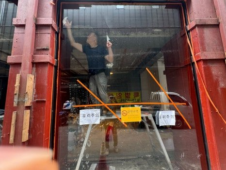 리모델링 중인 1층 건물에 레이노 8MIL 방범필름을 시공한 것은 정말 현명한 선택이었습니다.